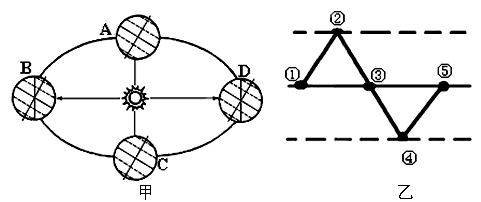 (5)在图乙的五个点中,能够表示全球昼夜平分现象的有 。形成图乙中太阳直射点回归运动的根本原因是 的存在。