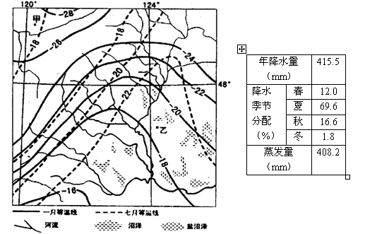 3、综合题 下图为我国某区域等温线图,表3为乙地区气候资料图,完成下列要求。