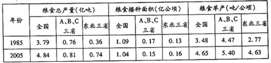 (2)图中A,B,C三省均为我国著名的粮食生产基地,与东北三省相比,其粮食生产自然条件的优势是什么?A,B,C三省、东北三省粮食总产量占全国粮食总产量的比重各有何变化?据表说明A,B,C三省产生这种变化的主要原因。