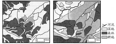 4、单选题 图是我国三江平原部分地区1950年(左图)和2000年(右图)土地利用变化图, 读图回答问题。