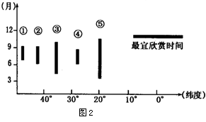 1、单选题 读“我国山水风景区最宜欣赏季节与纬度关系图”,完成下题。