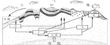 1、单选题 读图“地壳物质循环略图”,完成下列各题。