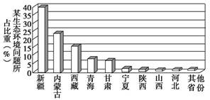 1.根据该环境问题分布的省区情况可以看出,该生态环境问题主要分布在我国西北地区,故可能是荒漠化。