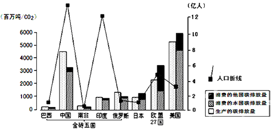 4、单选题  读 “世界部分国家和区域生产、消费碳排放柱状图及人口数量折线图”,回答下列各题。1.有关我国碳排放量的叙述,正确的是2.人均消费碳排放量