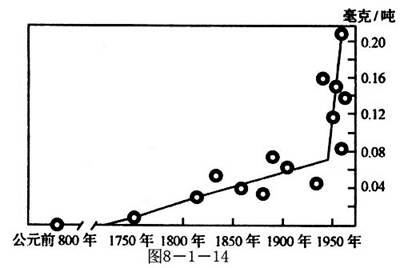 1、综合题  在洛陵兰岛的冰层里有大气状况的无字记录,科学家们到格陵兰岛的冰层上打钻,取出冰芯结果发现冰层中的铅含量与大气中铅含量的变化趋势完全—致。读(格陵兰岛冰川的铅含量随年代变化示意图8-1-14”,回答:
