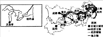 2、综合题 读纽约芝加哥位置示意图(左下图)和长江经济地带空间结构图(右下图),回答问题。