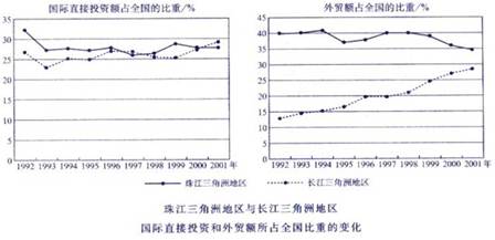 1、单选题 读该图“珠江三角洲与长江三角洲地区国际直接投资和外贸额所占全国比重的变化图”,回答问题: