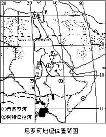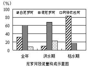 尼罗河是世界第一长河,主要支流有白尼罗河、青尼罗河和阿特巴拉河等。下图为尼罗河地理位置简图及青尼罗河阿特巴拉河尼罗河径流量构成示意图