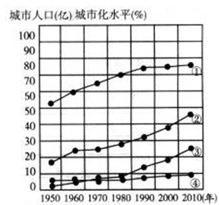 小题1:图中四条曲线分别代表发展中国家城市人口数、发达国家城市人口数、发展中国家城市化水平、发达国家城市化水平,它们对应的数码代号分别是