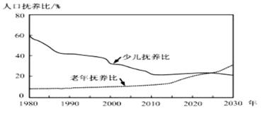 2、单选题 人口抚养比是指非劳动人口与劳动年龄(15~64岁)人口数之比。下图示意1980~2030年我国少儿抚养比和老年抚养比的变化趋势。读图回答下列小题。