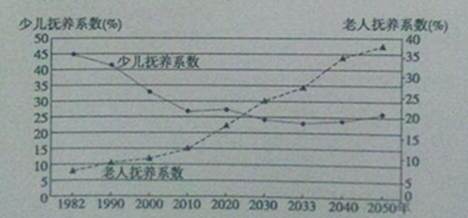 小题1:上世纪的少儿到现在已经正是劳动力,不会拖累和影响现在(2014年)的经济增长;图中2010年之后,老人抚养系数加快上升,说明社会养老压力加大,正确;到2020年后,少儿抚养系数并没有明显下降,但老人抚养系数不断上升,所以总抚养系数上升;注意两侧的纵坐标表示不同的抚养系数,预测到2050年老人抚养系数大约为37%,少儿抚养系数约为25%,两者相差约12%。故选B。