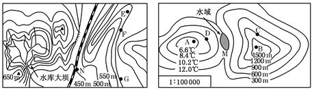 小题2:按照左图所示区域的大坝设计(坝顶的图上距离约为0.5厘米),则坝长和最大坝高(坝顶到坝底的垂直距离)大约分别是?( )