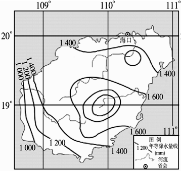 1、综合题 读“海南岛雨季降水量的分布示意图”,完成下列问题。(26分)