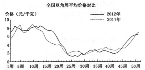 5、单选题  下图为全国豆角 2011、 2012 年价格对比图。读图完 成下列各题。