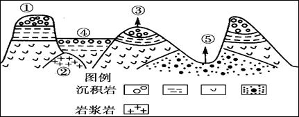 小题4:直接根据图例判断,⑤处为沉积岩,而大理岩属于变质岩;侵入岩、喷出岩都属于岩浆岩。