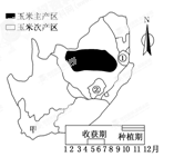1、单选题 如图显示的是某国家(图中①②不属该国领土)玉米生产区的分布和种植、收获玉米的时间。该国在黄金和钻石等矿产品发现之前,就曾经是个以农业为主的国家。据此并读图,回答问题。