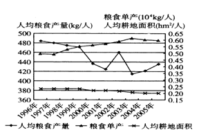 1.形成人均耕地面积和粮食单产变化的主要因素是2.2002年人均粮食产量突变的可能原因是