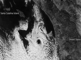 2、单选题 下图是2013年2月17日中午卫星拍摄的美国南加州海岸上空形成的大气涡流。该涡流呈逆时针方向旋转,中心在北纬32度、西经120度附近。