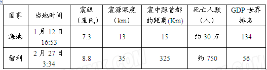 4、单选题  2010年初海地和智利先后发生地震。下表为两次地震的统计数据。
