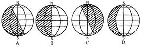 (3)在图二中用S 或N标注出极点的位置。将图一中C处的光照图画到图二上,并用阴影表示夜半球。(3分)