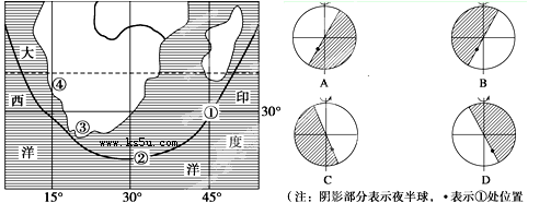 4、单选题 下左图为某区域海上航线示意图。在一艘驶往大西洋的轮船上,船员在图中①处看到了海上日出景观,此时为世界时(中时区区时)4时。读图回答下题。