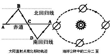 (1)将左图中的A、B、C、D标在右图适当的位置,并注出两至日。