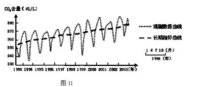 2、填空题 图11为“1993~2003年西伯利亚(即亚洲北部)沙果特湿地上空(1千米高度)空气样中CO2含量的变化观测统计图”。读图完成问题。