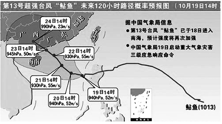 2010年10月超强台风“鲇鱼”预计于22日至23日在我国华南沿海登陆。受“鲇鱼”影响,广东、海南、广西等地可能出现狂风暴雨,次生灾害发生率增大,南海也将遭遇近20年来最恶劣海况。19日17时,国家防总启动防台风Ⅱ级应急响应。