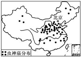 材料二:传统社会中,人们每遇到蝗灾时就到虫神庙中求蝗神接受人们的供品,不再吃他们的庄稼。下图为我国虫神庙的主要分布示意图。