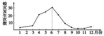 (1)读图可以看到,蝗灾发生次数最多的是在夏季。因为夏季气温高,适宜蝗虫大量繁殖、生长。