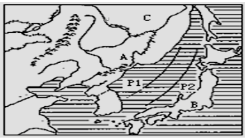 (2)图中P1和P2分别是两条闭合的等压线的一段。如果此时日本沿岸多雪,那么P1和P2的数值大小关系是?。(2分)