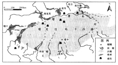 (4)指出图中绿洲分布特点,说明本区域环境承载力总体特征及其主要制约因素。(6分)