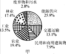 图甲是2004年全球不同行业的温室气体排放结构示意图
