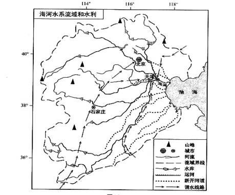 (1)从气候特点分析,该流域内降水量偏少且集中夏季,季节和年际变化大,所以使中上游地区平时地表径流量少,暴雨时洪峰流量大,从地形特点分析,中上游地区以山地、高原为主,洪水汇集时间短,因此需修建水库蓄水调节,既能防涝灾,也能防旱灾。下游地区以平原为主,排水不畅;且支流集中汇集于海河,导致排水不畅,因此需要开挖人工河道,主要用于排水泄洪。