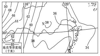 【小题1】地壳厚度的一般规律是海洋地壳厚度较薄,陆地地壳厚度较厚。根据图中显示东侧是海洋,地壳厚度较薄。所以图示地区的地壳厚度是由东向西逐渐增厚。所以C选项正确。