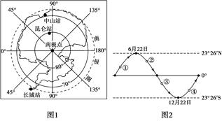 4、单选题 图1为“我国南极科学考察站分布示意图”。其中昆仑站于2009年1月27日建成,这是我国在南极内陆建立的第一个科学考察站。图2为“太阳直射点回归运动示意图”。读图完成题。