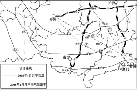 小题2:贵广铁路原来设计了图中的①②③三条路线,通过对投资成本、行车时间,经济情况比较,最后选择了其中的一条,请结合你所学知识,确定哪条线路最佳,并说明理由。(8分)