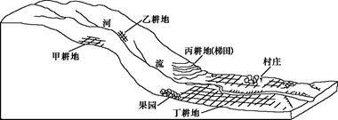 (1)根据材料二分析,丁地地势平缓,位于河流下游平原,因此灌溉条件最好。乙地位于陡坡,土壤侵蚀速度最快。