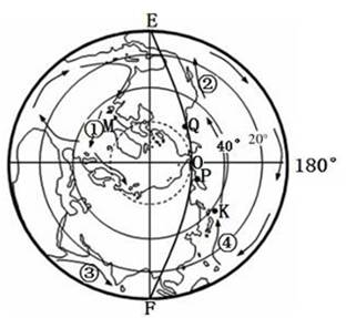 【小题3】若图中弧线EOF为晨昏线,根据北印度洋洋流是夏季洋流,呈顺时针方向,说明北半球是夏季,北极地区有极昼现象。所以图示北极圈内有极昼现象,EO为晨线,A错。FO为昏线,B错。北京昼长夜短,C错。根据图中经度判断,0度经线此时是正午12点,所以此时伦敦日影朝正北,D对。