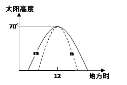 小题1:读图可知m、n两地正午太阳高度均为70°,且昼夜不等长,据此推测两地距离太阳直射点的纬度差为20°,并分居于直射点的两侧;而且该日太阳直射点不在赤道上。再根据m的昼比n更长些,推测m一定位于直射点所在半球的较高纬度地区。故判定:m地应该昼长夜短,n地有可能位于低纬地区。故选C。