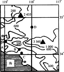 (1)C与图中较远处山峰的直线距离约为 千米。从A到B的地势变化是 。(4分)