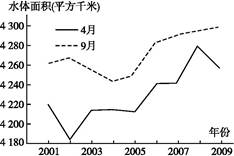 (1)由青海湖水体面积变化曲线可知,总体上看,2000~2009年青海湖水体面积在不断扩大。 (2)结合材料,从自然原因和人为原因两方面进行分析。
