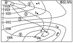 小题2:此时,图中a、b、c、d四地最有可能出现阴雨天气的是