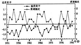 材料二:下左图示意中国1951——1981年地表温度距平与寒潮频次的变化。
