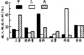 2、单选题 图中甲、乙、丙反映了三类工厂的投入构成情况,据此回答题。