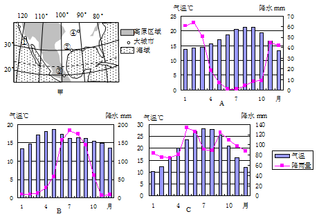 小题1:甲图中的四个城市与A、B、C三幅气候资料相符的是: