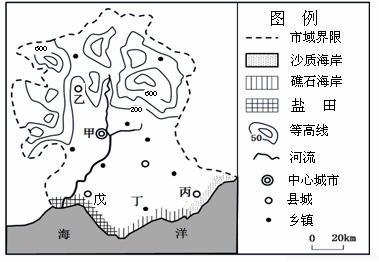 1.乙地靠近山区且远离河流,不适宜大力发展水产养殖业,丙地为沙质海岸,在适宜附近建设海滨浴场,沿海地区大力发展海水淡化成本高,该区域为我国南方,降水量大,淡水资源充足,丁地为礁石海岸,不适宜在种植红树林。