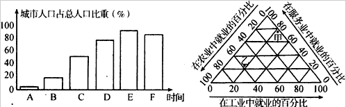 1、单选题 读某地区“城市人口占总人口比重变化图”和“劳动力在各行业中的百分比图”,完成1—2题。