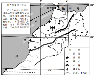 5、综合题 下图中甲国以山地、高原为主,有“烈日下的清凉国土”的美誉,磷矿储量和出口量居世界第一,人口约3000万,经济发展水平不高,旅游业、渔业和磷酸矿的出口是其三大经济支柱。近年来,该国拦坝蓄水,兴修水利;引进外资,创办免税工业园。 10分