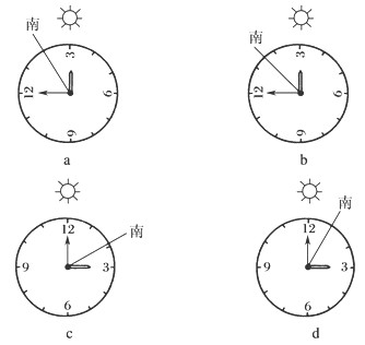 (3)北京时间下午3时,该兴趣小组在该地借助太阳的位置用手表确定正南方向(表面朝上)。下图所示四种方法中正确的是(填代号)________。